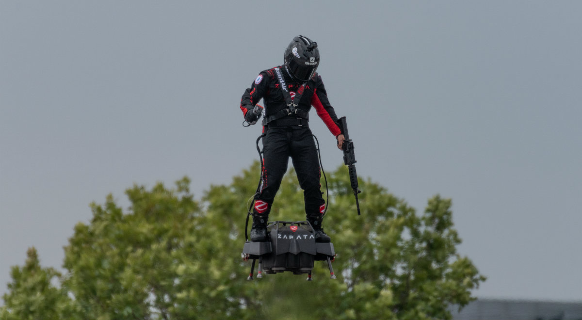 此前,在7月14日的法国国庆阅兵式上,法国喷气滑雪世界冠军扎帕塔手持步枪,站在自己发明的飞行器上,在阅兵式观礼台上空飞行了数十米。