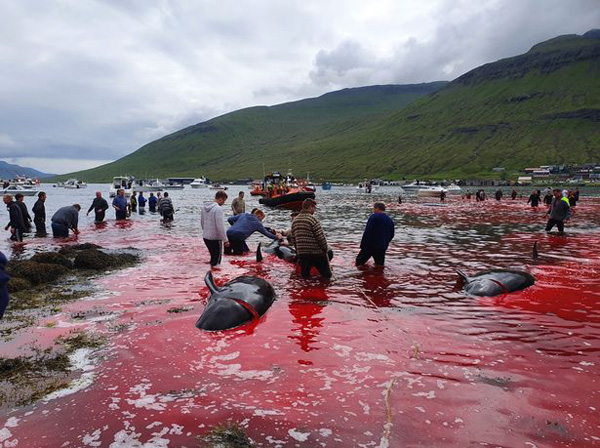 据英国《镜报》8月5日报道,近日,在丹麦法罗群岛的Hvalvik湾,人们捕杀了23头鲸鱼以获取鲸肉和鲸脂,海水被鲜血染红。法罗群岛上的居民数百年来以捕杀鲸鱼来度过寒冷的冬天,他们声称捕杀鲸鱼是一项可持续的活动,并且受到法律监管。