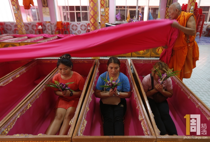 当地时间2019年8月报道,泰国暖武里府,民众躺在寺庙的棺材里,参加僧人们主持的“复活”仪式。民众躺在棺材里,僧人用一块布将他们盖住,吟唱葬礼上的挽歌。民众相信这种仪式可以驱除厄运,迎来新生,保佑身体健康。