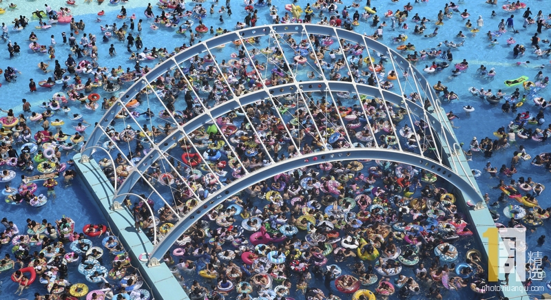 当地时间2019年8月11日,日本爱知县,时值盛夏,长岛度假村人满为患,游泳池里塞满了人,想要游泳也是有难度啊!