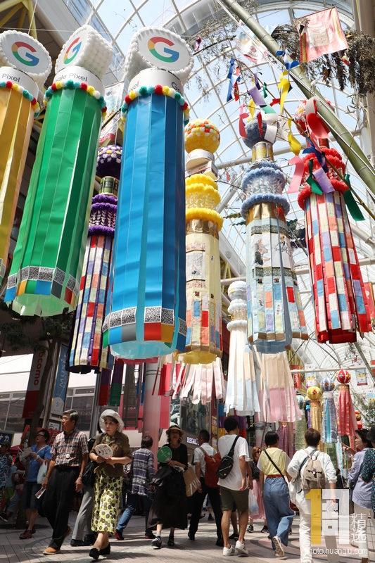 当地时间2019年8月6日,日本仙台,人们在满是装饰过的竹竿的街道上行走。当天,令和时代首届仙台七夕节开幕。仙台街道上有共约3000根被彩色纸质飘带装饰的竹竿。仙台七夕节是日本主岛北部东北地区的三大节日之一,于每年7月或8月举行。