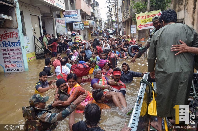当地时间2019年8月8日,印度Sangli,当地因持续性暴雨引发洪水,军队人员营救被困民众。