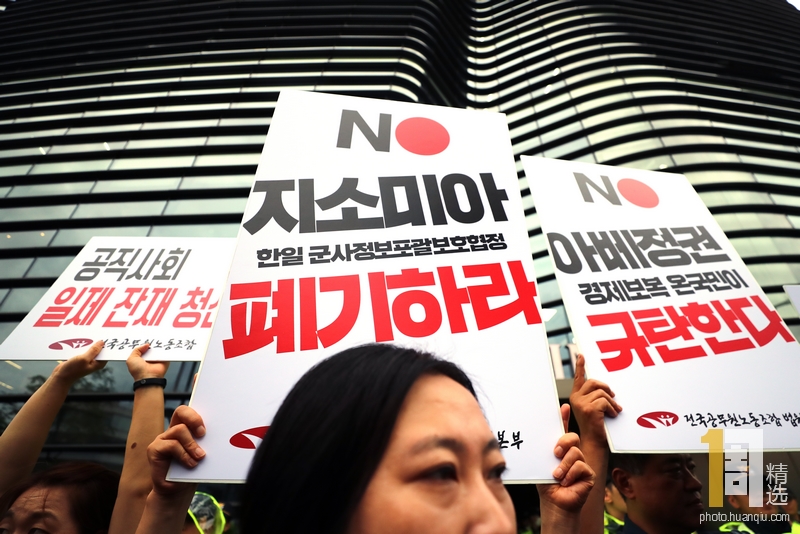 当地时间2019年8月7日,韩国首尔,韩国示威者在日本大使馆前集会,抗议日本将韩国排除出贸易优惠“白名单”。日本政府在上周决定将韩国踢出贸易优惠“白名单”后,7日正式发布了这一决定的政令。就此,日本将于本月28日扩大对韩国的出口管控。