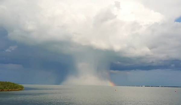 微暴流是因雷电风暴中的气流下沉而形成的,是由雷雨或阵雨产生的小规模强降水,直径约2.5英里(约4公里),分为湿微暴和干微暴 。此次发生的正是湿微暴。云层与水层表面的大雨混合在一起,形成了美丽的彩虹和朦胧的景色。
