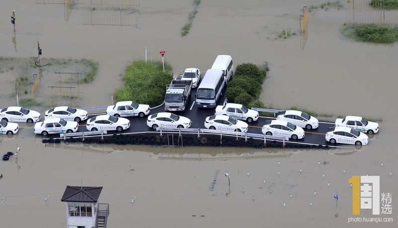 当地时间2019年8月28日,日本佐贺县,当地暴雨肆虐引发洪灾,俯瞰洪灾现场,房屋和车辆被淹。