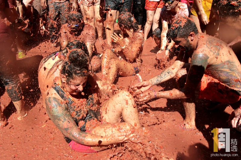 当地时间2019年8月28日,西班牙瓦伦西亚,当地举行了一年一度的“西红柿狂欢节”(Tomatina),狂欢者互相扔西红柿,到处一片红泥雨,热闹非凡。