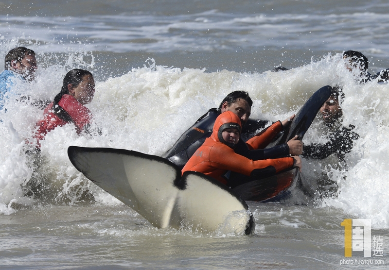 当地时间2019年9月16日,阿根廷Mar Chiquita,7头虎鲸在海岸附近搁浅,志愿者和救援人员奋力营救,成功帮助6头虎鲸重回大海,有1头虎鲸死亡。
