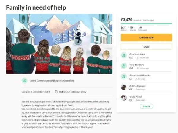 当然,尽管快要养不起孩子,但夫妇两有手有脚,所以也从来都放弃过生活的希望,努力寻找工作来养活整个家,格兰姆斯可歌可泣写完自己的故事后,继续写到:"她和孩子的父亲本来不准备都上网寻求帮助的,可是圣诞节就要来临,而他们还没钱准备好孩子们喜爱的圣诞树和礼物。" "所以,我们在万分艰难的情况下才厚着脸皮的"开口"开启了这个筹款活动,请各位善良的网友在力所能及的情况下帮帮我们一家子。" 筹款活动发出后,很多网友相信了夫妻两在网上的说法,并向他们"踊跃"捐钱。