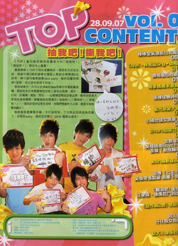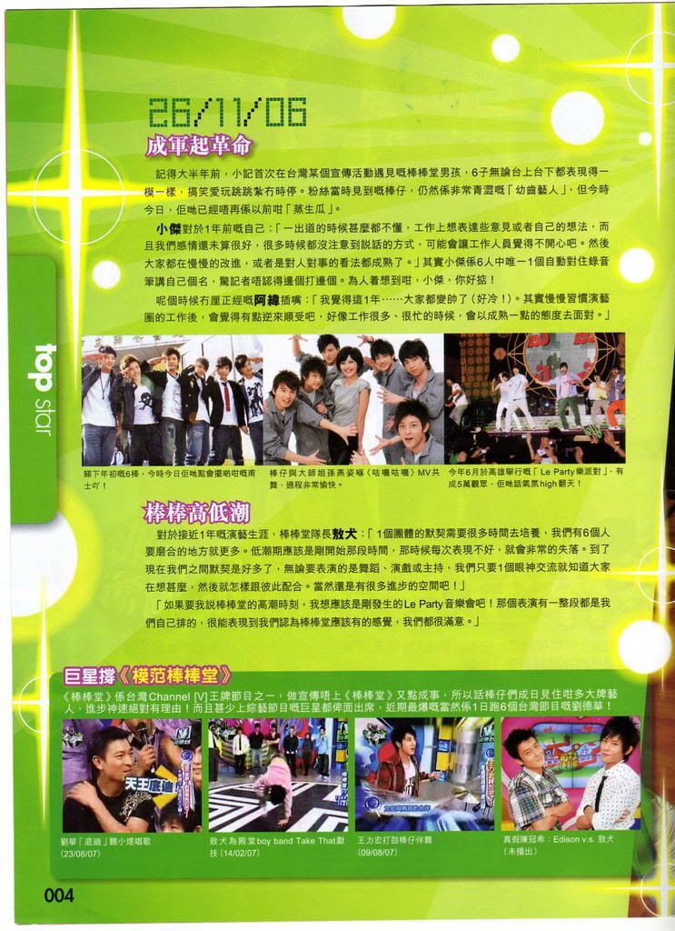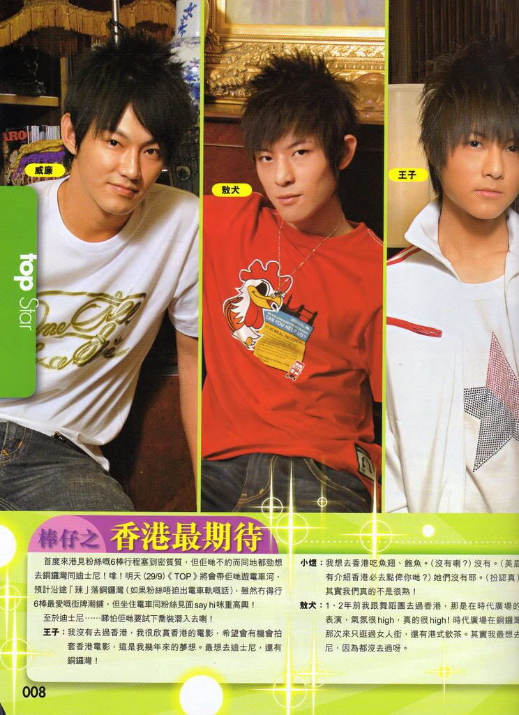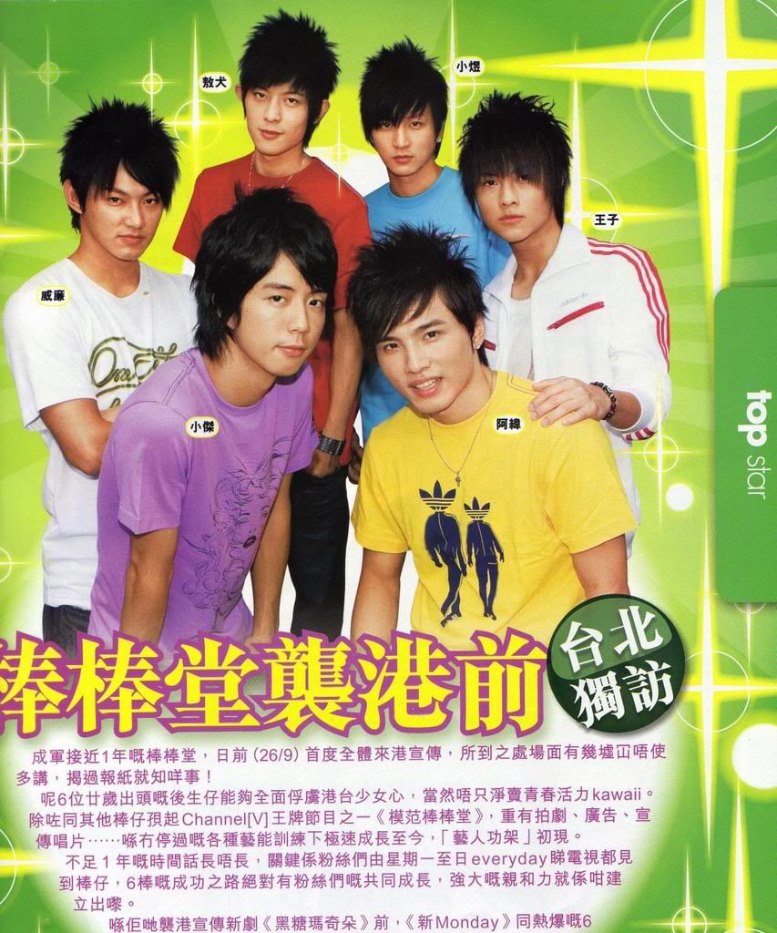 這6個20多歲的青少年全面俘虜了香港台灣少女的心,當然不只是青春活動可愛。還有Channe[V]王牌節目之一<模范棒棒堂>,還有拍戲,廣告,宣傳唱片......在各重藝能訓練之一已經有藝人功架...