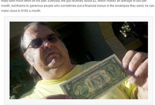美国亚利桑那州的60岁退休工人Gary想出一种简单又不至于违法的“赚钱”方式——他在自己所有的1美元钞票上写下“请把这张钞票还给我,我很穷”并注明自家地址,结果真的有不少人将他花出去的1美元寄回,他每个月靠这方法能赚到100美元。美媒《odditycentral》报道称,由于Gary只是单纯地向别人要钱,并没有以非法手段逼迫他人,因此行为不构成违法。而他只使用1美元钞票的原因在于,跟10美元、20美元或更大面额的钞票相比,人们更愿意愿意舍弃它。事实证明,他的方法对路,越来越多的人愿意将钞票寄还,甚至还有从荷兰或澳大利亚等遥远国家的人特地将他的钱寄回,昂贵的邮寄费早已超过他原本的钞票金额。 Gary称对自己的行为不觉得丢脸,因为他希望有幽默感的人们,能开个玩笑配合。也有人在归还钞票的同时,还在信里对他的省钱妙招赞不绝口。