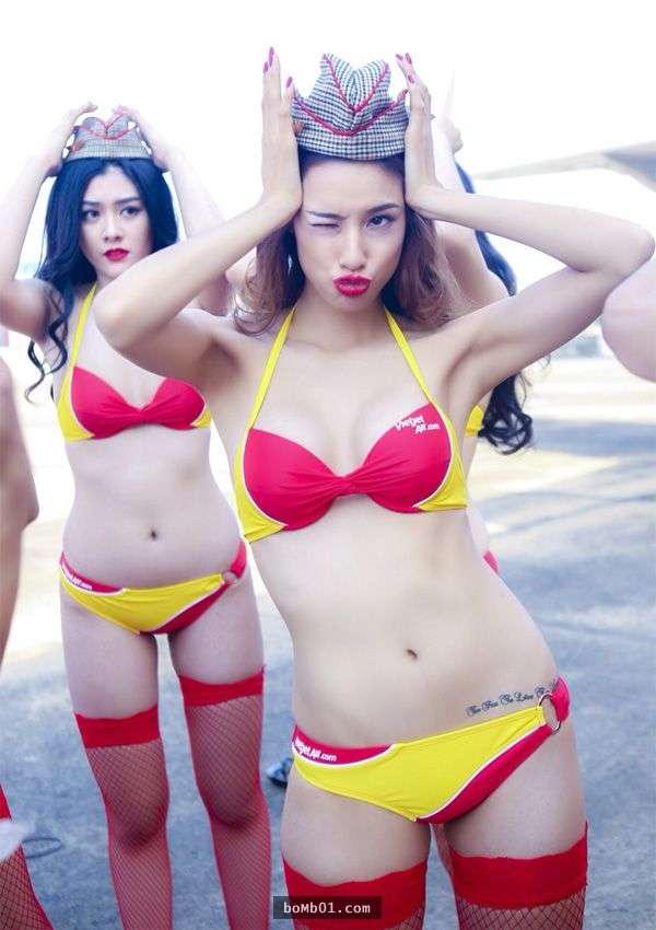 ▼在越捷航空的广告中,长腿的模特儿扮成空姐,穿上绣有越捷航空标帜的比基尼,颜色也以越捷的黄红作为主要配色,再搭上大红色的网袜,一口气打响了越捷的知名度。
