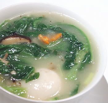 3. 水滾後將搓好的湯圓輕輕放入,以勺背在水中輕推以免湯圓沾黏(用撈的湯圓容易破),等湯圓浮起呈略透明後再放入青菜、油蔥酥即可。