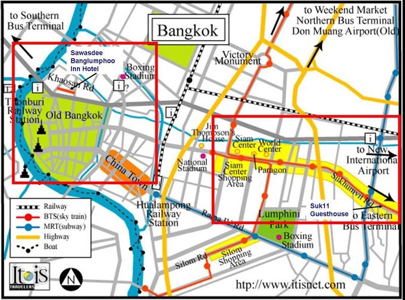 曼谷其实也分蛮多区的,其中最出名的就是老曼谷靠近chao phraya的那一带,和 sukhumvit在市中心,交通发达的地方,有先进的MRT,LRT站