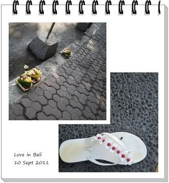 RUP300K. 因为第二天去Tanah Lot 去看日落了,所以我们决定不去Jimbaran 啦。。。。 KUTA 之旅 睡饱饱了,是时候去Kuta 走一走。。。 KUTA 到处都有人拜拜,到处都是一盒花和一支香。。。要小心看路。。。 我一不小心,就中地雷了。。。 我的脚板被香烫到啦,马上起水疱,我叫我的Bi “拍一拍”,他拿起相机拍我的鞋子???其实我要他拍一拍我的鞋子,能走香头