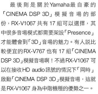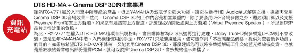Yamaha 的做法是這樣,無論你的音訊是什麼格式,它都可以將原來的訊源再套用自家的 DSP 效果,通常會有一二十個或者更多不同的 Program 可以選用,這並不會犧牲原來的訊號,如果你的訊源是 DTS-HD,當你啟動了 Yamaha DSP 效果,它會變為 CInema DSP HD 或 HD3 等。
