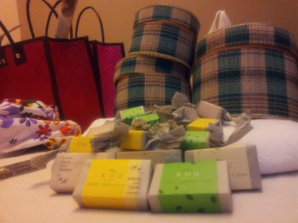 大的竹藤编织包包(rp100,000.Ubud market买),化妆包(rp51,000一套3个size,tanah lot oleh-oleh),左边花花的是裤子(4件sukawati买,rp120,000),9粒小肥皂,5粒大(kou,rp237,000)