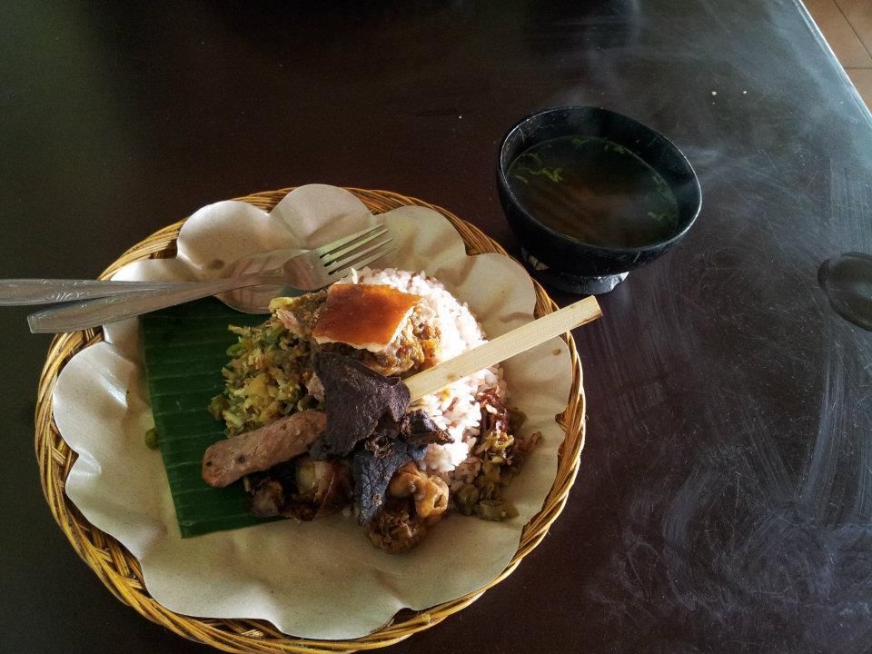 这就是今天的午餐,一盘rp20,000,糙米的饭,猪皮蛮硬的,而且好辣噢,他觉得还好,汤也好好喝噢