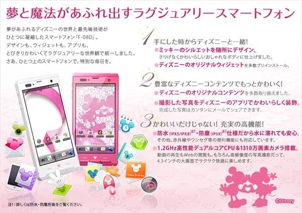 Fujitsu F-08D 採用 Android 2.3.5 作業系統,其在迪士尼 Disney 的加持下,大量採用迪士尼人物進行裝飾,使得它的內外部都能讓使用者感受到客製化機種的特別之處。