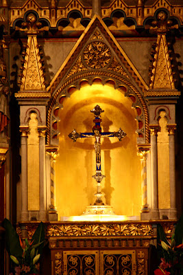 我们从前方一道侧门进入教堂里边,几缕阳光透过高大的彩窗,在大殿里洒下暖暖的光芒,为略为阴暗的大殿带来一股神圣庄严的气息。当眼睛经过了一段短暂的适应之后,这才清楚发现教堂内部的华丽程度堪比皇宫内院,尽显辉煌富丽景象,那些表面光滑的巨大深色大理石柱子,雕工精细的大理石浮雕,色彩斑斓的精美壁画与及绚烂的彩绘玻璃,简直美不言喻!穹顶华丽精美的镶嵌画记载了匈牙利第一任国王依斯特万(圣史蒂芬)的生平记事与及圣经里所记载的故事。阳光透过穹顶上的窗口倾泻下来,犹如天堂之光那般沐浴着竖立在大主坛正中央的圣史蒂芬大理石雕像,为大主坛增添一股神圣庄严的气息。位于主坛后方的礼拜堂内存放着一只木乃伊状的右手,经过考古验证,这就是圣史蒂芬的右手,是这里最为神圣的物件。还以为有机会可以一览实物,没想到我们只能从远处观望一只精美华丽的黄金盒子而已,根本就没法一睹收藏在黄金盒内的圣物。
