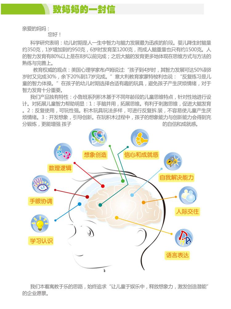 关于启蒙:积木颗粒专为宝宝设计,大小适中,边角磨圆,对宝宝非常安全。可消毒易清洗,通过ISO9001质量体系认证,符合中国、美国、欧共体严格的玩具安全标准。每年推出几十种新产品,目前国内销售产品百余种,满足不同年龄段宝宝的需求。颗粒拼插玩具是进行亲子游戏的最佳玩具,有助于培养家长和宝宝的感情,而宝宝也乐于在游戏中接受教育。