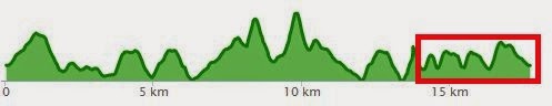 当我跑过了14公里,感觉右脚大腿和小腿肌肉有点开始要抽筋了。如果此刻我尽力跑,一定会抽筋,于是乎我改变了跑法,放慢然后缩短步距。接下来虽然没有很长或很斜的斜坡,但是却有连续的上下坡(下图红框) 。一坡未平一坡又来,没有停下来走路已经很好了。这次做到了。
