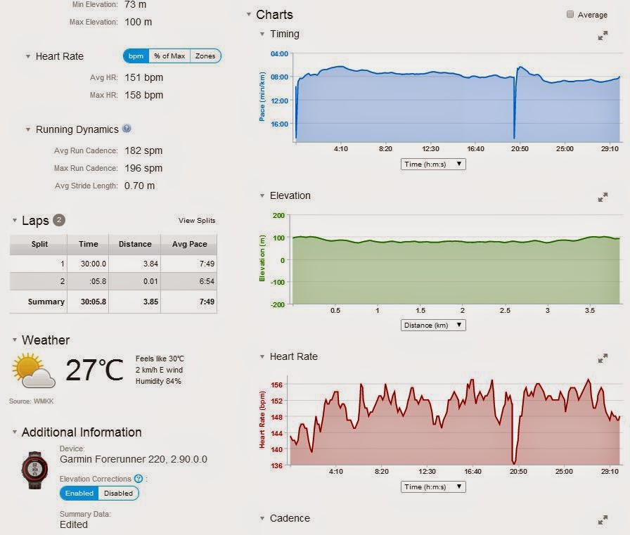 从起跑到5公里处,心跳都保持这169左右,手表的警示一直提醒着自己。渐渐地跑过8-9公里的上下坡后,心跳都维持在180左右,而这也是整个赛事的平均心跳。前面9公里必需感谢Gavin Yong的陪跑,没有他我可能就会用更慢的速度跑而不能达标(这时候要达成目标2已经不可能,转而专注在目标3)。
