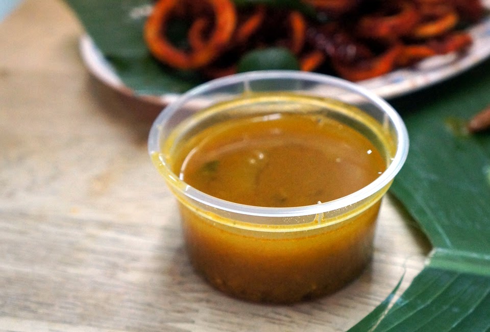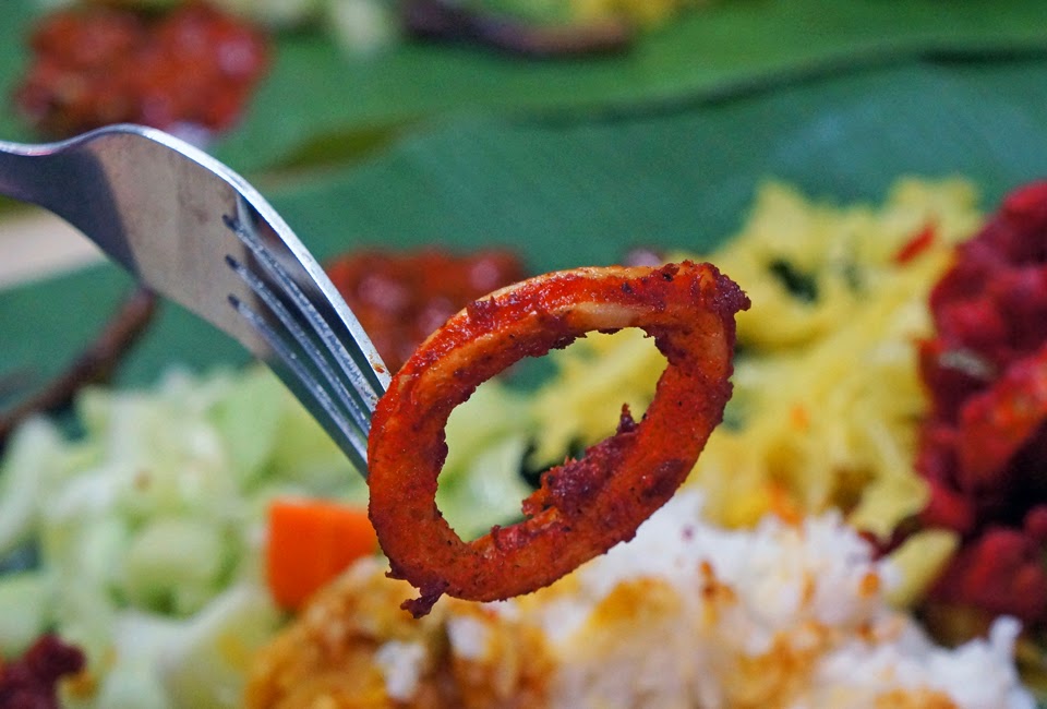 炸sotong相较起来口感就友善得多了,炸得偏干的苏东有另一种滋味,粘上酸柑汁后很是对味。