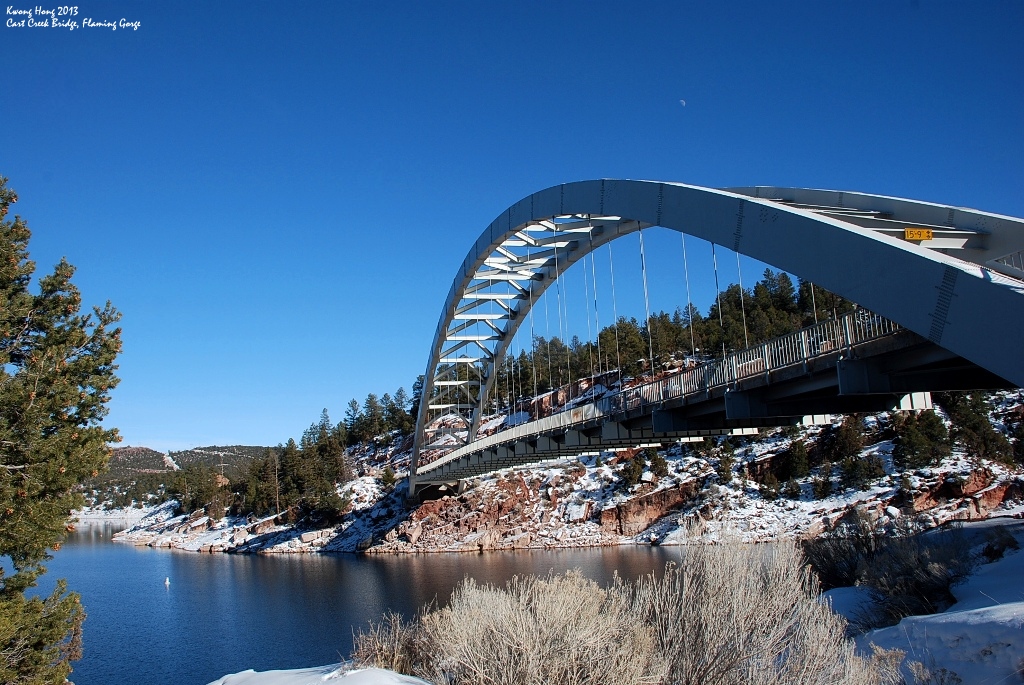 后来我往Flaming Gorge Dam的方向开去,途中也有几个观景区,拍了不少照片。其中Red Canyon最令人印象深刻。我需要离开公路驶到林子旁的小路一路开数公里才抵达Red Canyon,这里我看见有钓鱼的指示牌,应该是冰上钓鱼活动的地方。Red Canyon是个峡谷,峡谷两旁都是红色岩墙,只是冬天都被点点雪迹掩盖了红色。下边是缓缓流动仿佛静止的Green River。Red Canyon高约1700尺,宽约4000尺,景色宜人。我小心翼翼地走过防护栏旁厚厚的积雪,欣赏着弯弯的峡谷,慨叹自然之美。想到开车越过小路到这个地方,有种寻获宝藏的成就感。