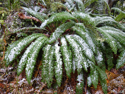走到中午时分时,一直乌云满天的天空终于回复纽西兰最漂亮的颜色--一片蓝蓝色的天空!!!看着蓝蓝色的天空,心情顿时也好了不少。由于天气转晴,树枝上的积雪和冰就融化的更快,每当走过一片类似的树林,我就需要冒着水滴前进,就好像在雨天赶路似的。。。纳闷啊。。。