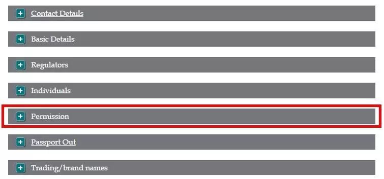 下面让我们进入正题,打开我们熟悉的FCA监管页面,其中Permission(红色框内)的展开菜单就是这家公司可以提供的金融服务的细则。 一家正规监管的FCA交易商(Broker)所显示的Permission细则包含: