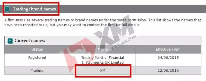 XM是Trading Point金融集团旗下的注册商标,于2016年取得英国FCA全照监管,监管执照号为:705428。所有客户均可登录FCA官网,通过输入该执照号查询到XM FCA监管详细内容,并且可以在”Trading/brand names”一栏下查询到XM作为Trading Point注册商标的监管详情。