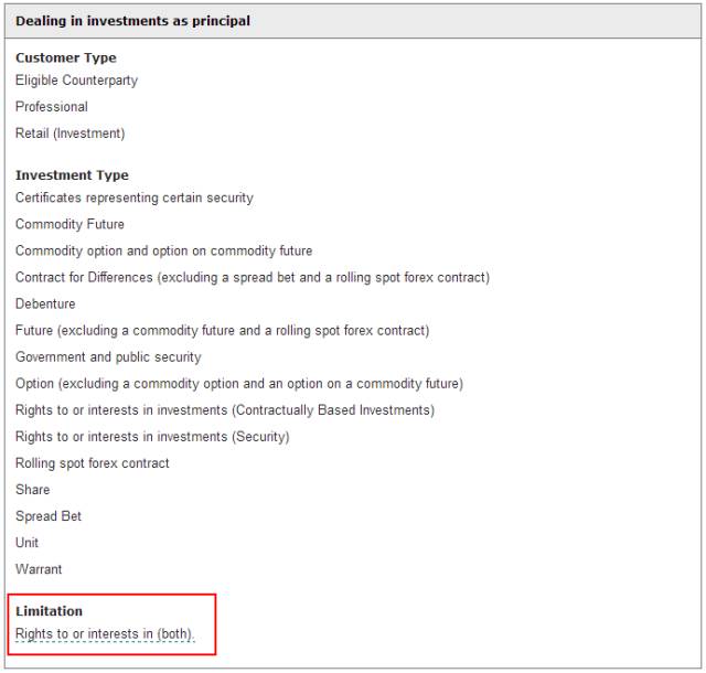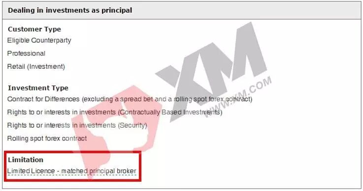 所以在FCA的监管页面下,纯STP交易商被定义为 Matched principal broker (匹配主体交易商)显示在Limitation中。