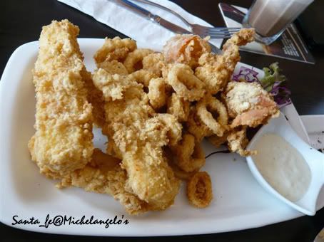 大家可以一起分食的併盤,有炸花枝,炸軟殼蟹和。。。我最愛的炸mozzarella cheese 花枝外層炸的酥脆,裡面的肉質也挺美味 ~搭salad醬吃很剛好