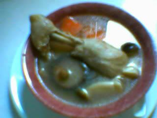 用了包装药材鸡的料,两只鸡尾,两汤匙水,红枣及枸屺用锡纸包起来,密封蒸一个小时。包装药材的份量是给一只鸡,我只放了1/3包的份量。开起时有浓浓的药材香,鸡腿嫩嫩的,好吃。如果加多点水,它的汤汁一定很好喝。