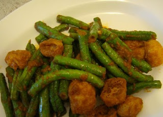 2。接着把四季豆,红辣椒,玉蜀黍粒,菜圃通通放下去炒。