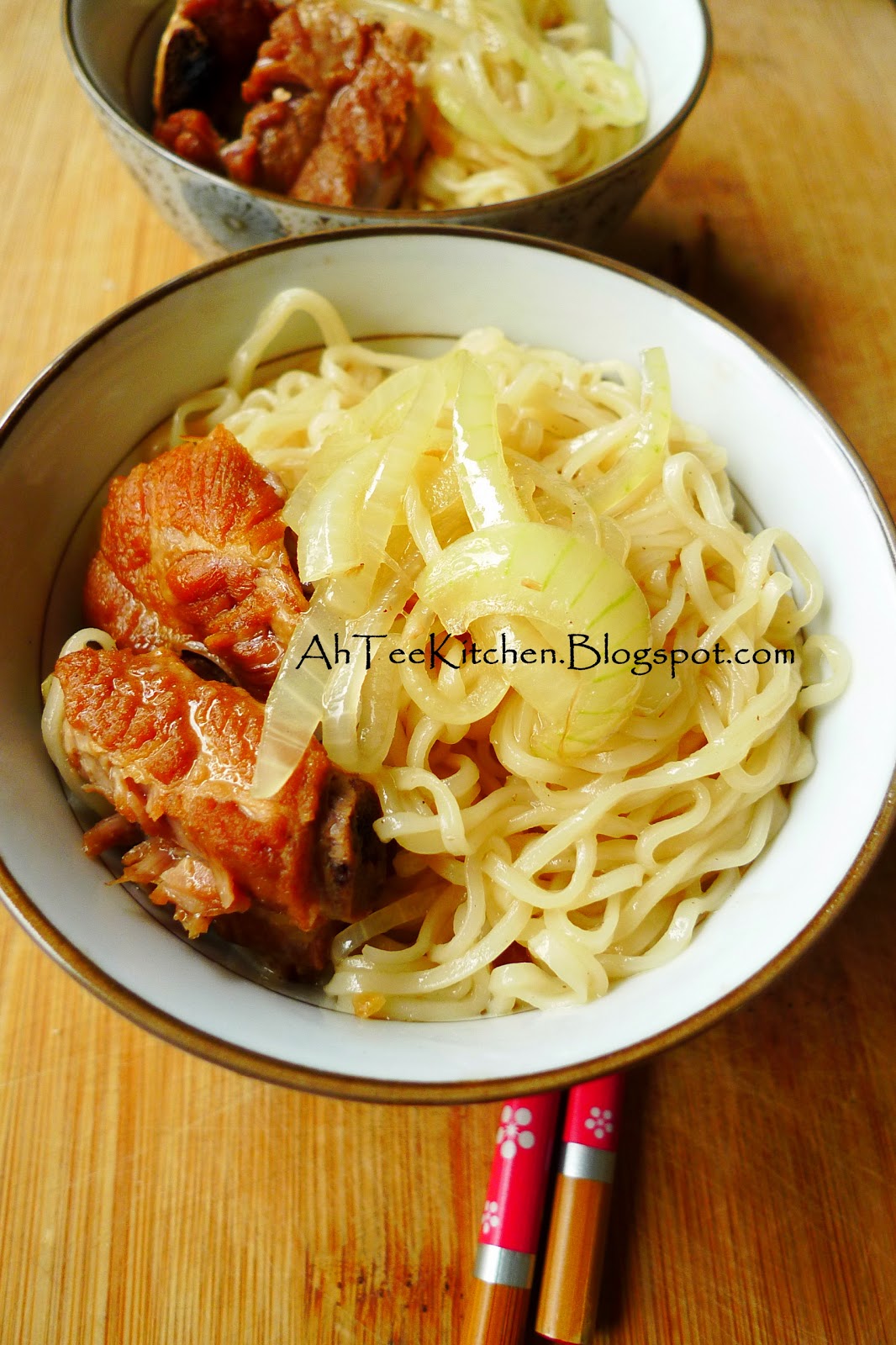 唯一面2片[烫7分熟备用], 罐头红烧排骨1罐, 洋葱一颗[切丝], 蒜米酥油2大匙