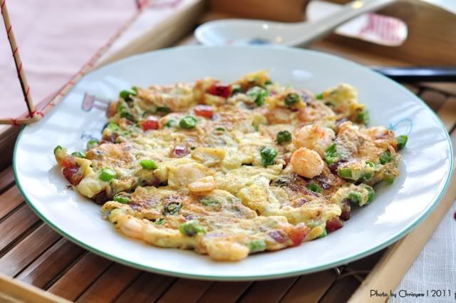 材料 - 两个蛋打散,腊肠一条切小块,虾仁,青豆,调味(胡椒粉少许,酱油少许)