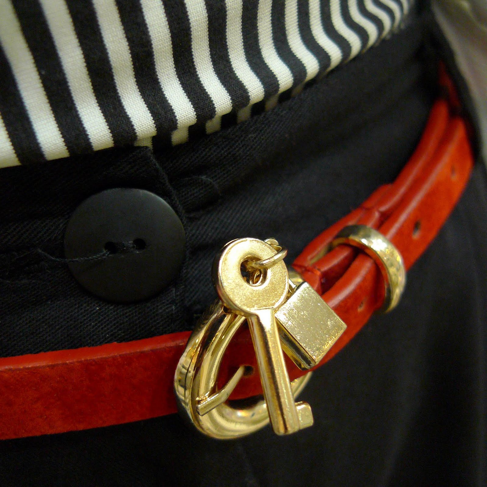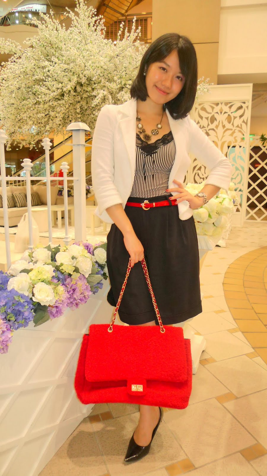 当天的主题要属这红色皮革金属细腰带了,让整体的黑白配有着画龙点睛的效果,