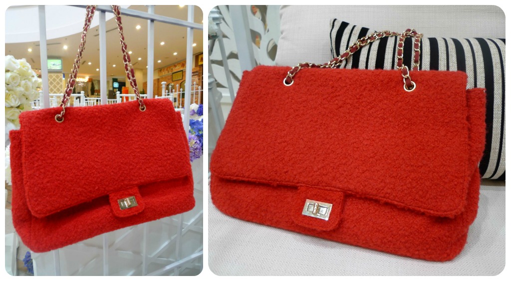 而包包呢,我则选择了红色的毛呢香奈儿经典款式设计的皮革混合金属环扣链的包袋