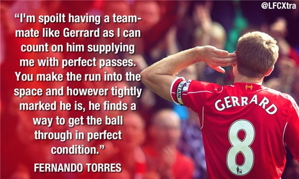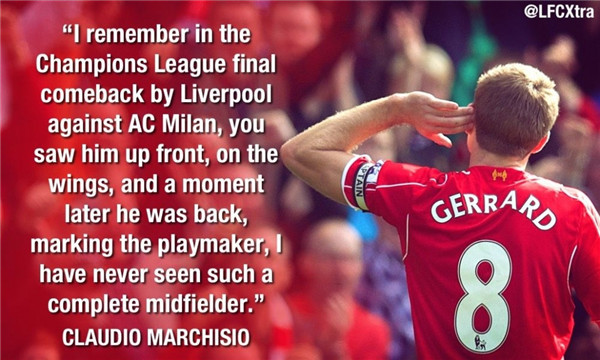 “杰拉德为利物浦所做的贡献已经超越了足球范畴,他从未拒绝自己必须为俱乐部所做的任何事,他也为自己能成为俱乐部的队长感到骄傲。你看到了这家俱乐部过往一些伟大的队长在数年间以身作则,率领球队,而杰拉德至始至终都是这么做的。他是个独一无二的家伙,完全称得上是这家俱乐部的传奇。”
