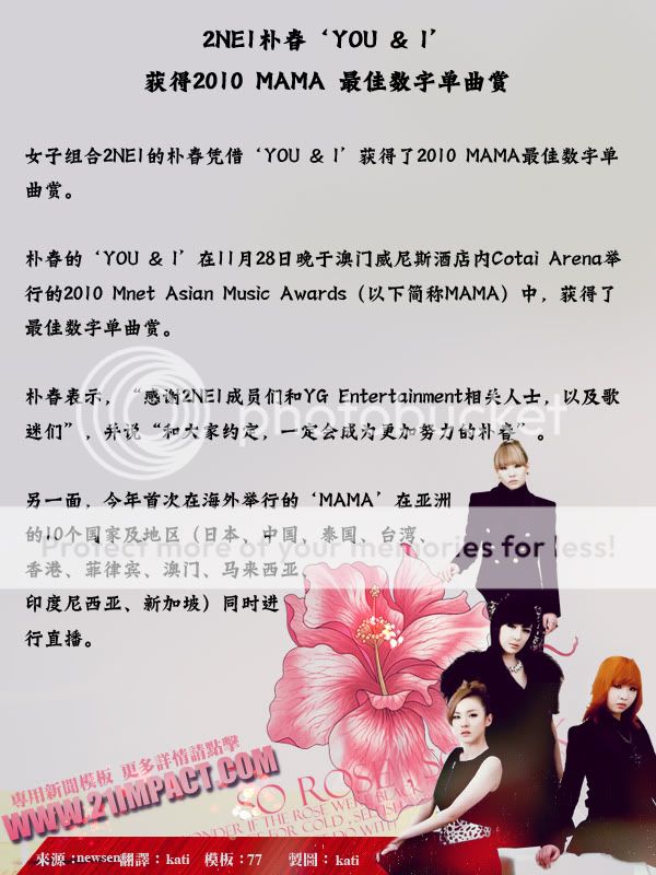 2NE1朴春‘YOU & I’获得2010 MAMA 最佳数字单曲赏