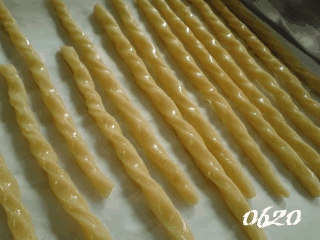 4 两手拿起一根长条的两端,扭几圈,再放到铺了锡纸的烤盘里。