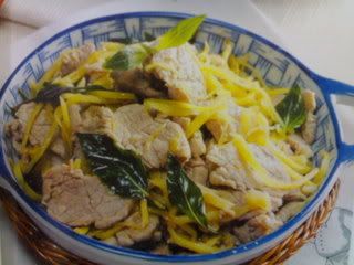 2)烧热麻油爆香姜丝和蒜茸 ,加入肉片及冰糖 ,翻炒至肉熟 .