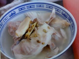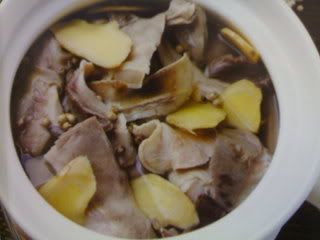 2)老姜切快 ,拍扁 ;猪脚用滚水烫过 ,洗净沥干 .
