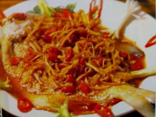做法:1)烧热麻油 ,把鱼煎至两面金黄色 ,盛起备用 .