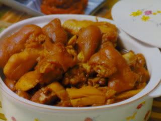 做法: 1)将猪脚斩小块放入滚水川烫15分钟后捞起 后泡冷水.
