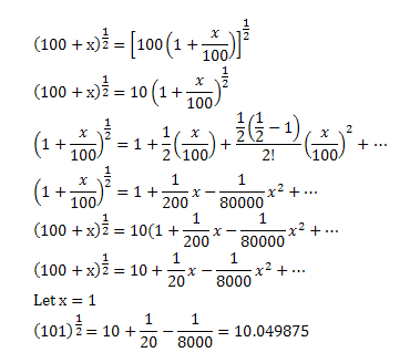 expand (100+x)^(1/2).hence,find the value of (101)^(1/2)