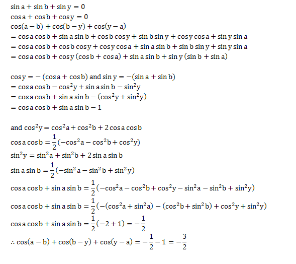 Evaluate cos (a-b) + cos (b-y) + cos (y-a) |
