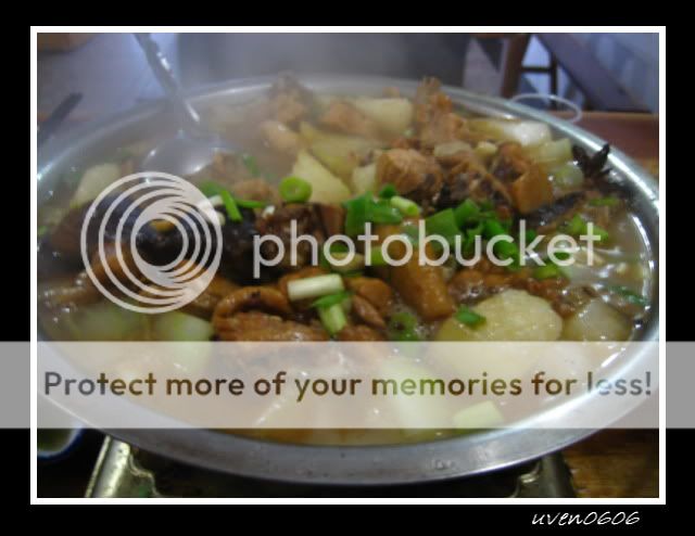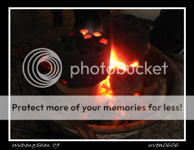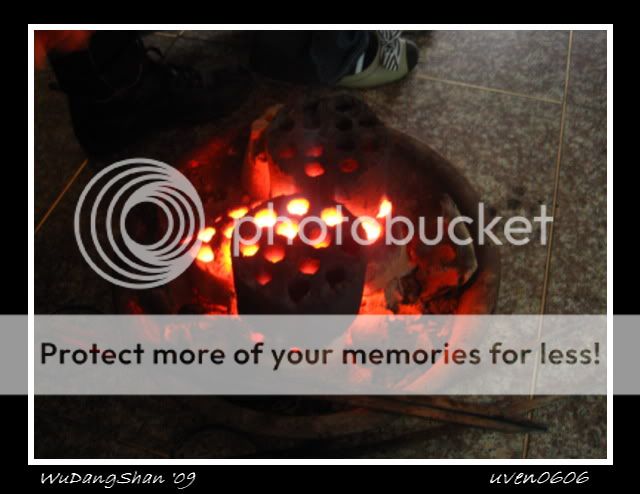晚饭时间,就在酒店附近的餐馆随便进餐啦。呵呵,天气很冷,在等待上菜时,我们就先在热炭哪儿取暖啦!天气那么冷,我们就点了鸡肉火锅,这样菜才不会那么快凉。然后就另外叫小菜,老板说是野菜,叫步步高。就这两样,3个人吃。我还买了小瓶的武当山高粱,但我们只喝了一点。