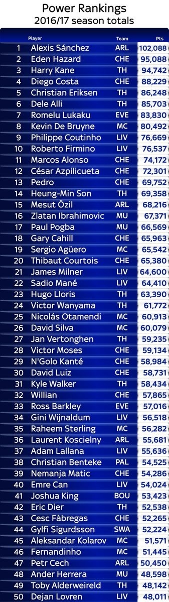 切尔西和热刺则包揽了榜单靠前的绝大多数位置,阿扎尔(2)、科斯塔(4)、阿隆索(11)、阿兹皮利奎塔(12)、佩德罗(13)、卡希尔(18)、库尔图瓦(20)、摩西(28)、坎特(29)、路易斯(30)、威廉(32)、马蒂奇(39)。